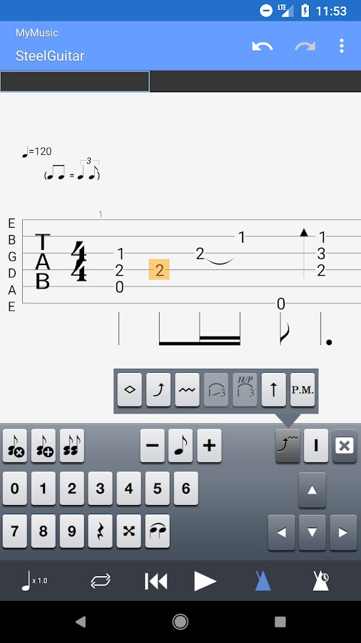 О: В отличие от Guitar Pro для Windows и Mac, это приложение не позволяет изменять нотацию в существующем файле Guitar Pro или создавать нотную запись в стандартной нотации. Тем не менее, имеется возможность редактировать однострочные табулатуры в редакторе NotePad. Редактирование строки ударных невозможно в программе NotePad.