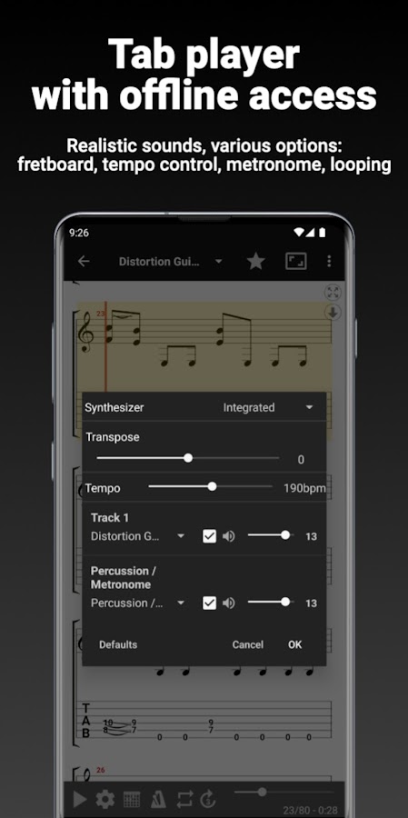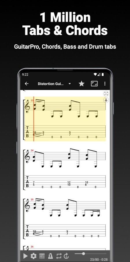Он включает в себя табы и аккорды GuitarPro для гитары, баса, гавайской гитары и барабанов, доступ к которым также возможен в автономном режиме. В дополнение к большому выбору у вас также есть возможность импортировать собственные файлы вкладок. Синхронизируйте избранное и плейлисты на разных устройствах.