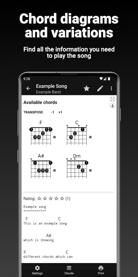 ☆ Множество других функций: полноэкранный режим и режим автопрокрутки, различные варианты отображения, аккорды для левой руки и многое другое!
