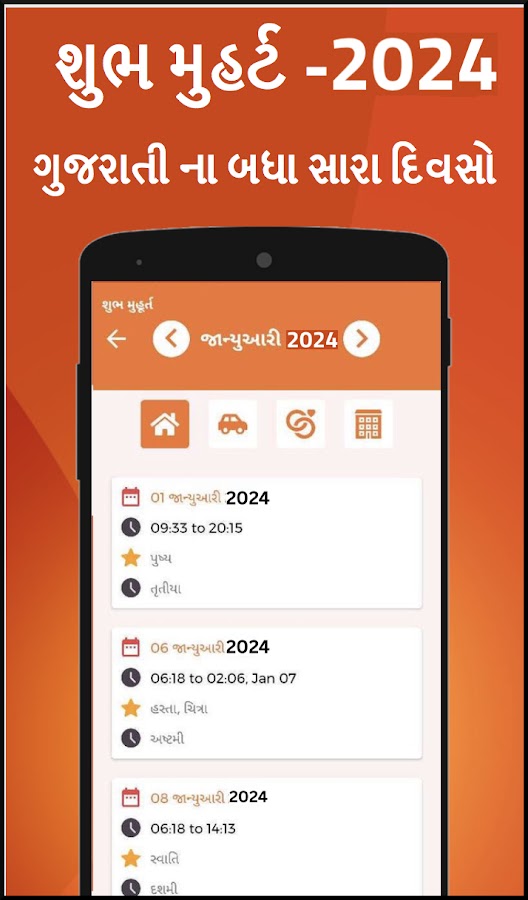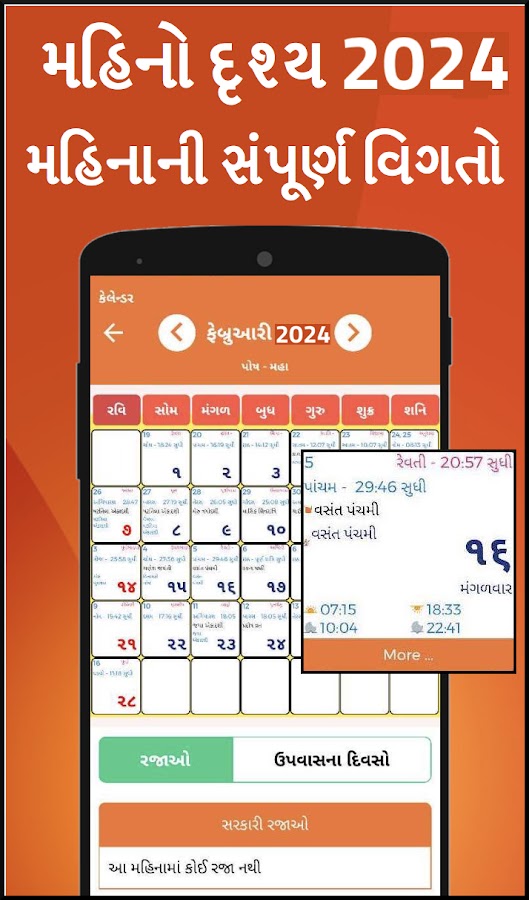Гуджаратский календарь на 2026 год — ગુજરાતી કેલેન્ડર 2026: Это лучший календарь Гуджарата на 2026 год. Это бесплатное приложение включает фестивали, праздники, Шуб Мухурт (даты брака, дата покупки автомобиля, новоселье / даты Гриха правеша). Также есть подробности каждого дня, такие как Маса Саптаха и Тариха. В приложении есть информация о панчаках, такая как Пакша Каран йога Титхи Накшатра Амавшья Рахукал Панчанг и Кундали Торан Харилал.