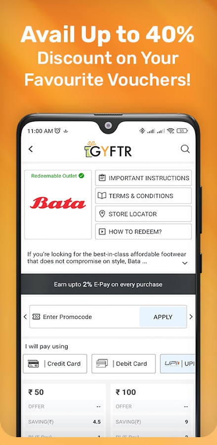 При покупке подарочных карт онлайн ваш ваучер GyFTR мгновенно отправляется по SMS, электронной почте или WhatsApp, поэтому вы можете подарить или использовать его сразу же. Вы можете комбинировать свою подарочную карту GyFTR с предстоящими распродажами, предложениями по кредитным и дебетовым картам, а также бонусными баллами, чтобы суммировать скидки.