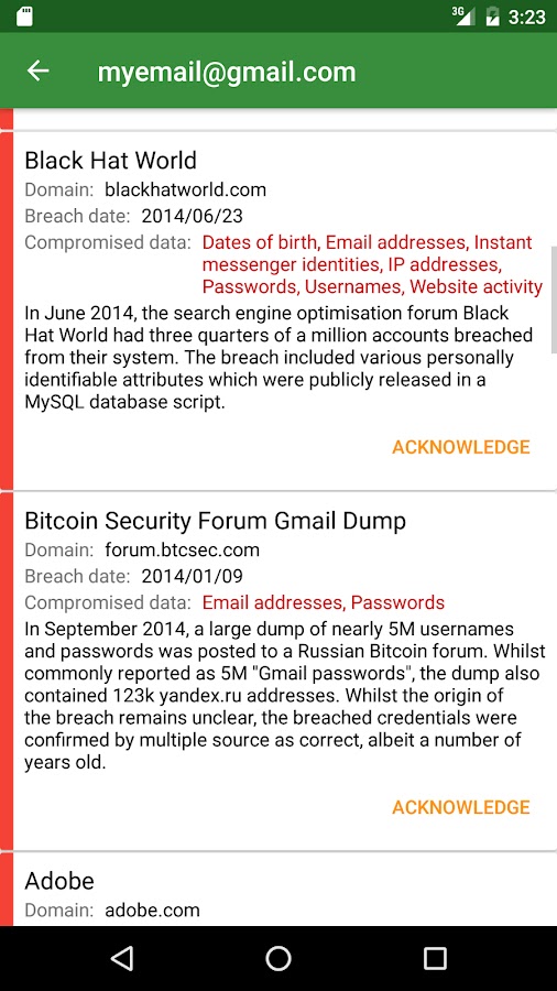 Это приложение позволяет осуществлять поиск в базе данных haveibeenpwned.com для списка счетов (или адресов электронной почты), которые были просочились в нарушении данных, который был подключен к Интернету.