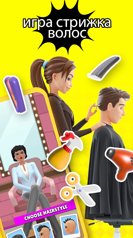 Создавайте сумасшедшие стрижки, обривайте головы или рисуйте татуировки на волосах. Соревнуйтесь с друзьями и завоюйте титул Мастера-парикмахера! ✂️💈