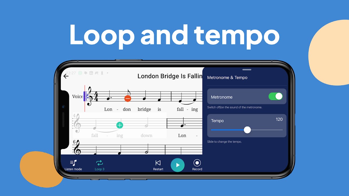 С Halbestunde вы можете персонализировать свой учебный процесс. Уменьшите темп, добавьте удары метронома, чтобы следить за ритмом, зацикливайте сложные партии, пока не освоите их, транспонируйте ноты, чтобы адаптироваться к своему собственному стилю.