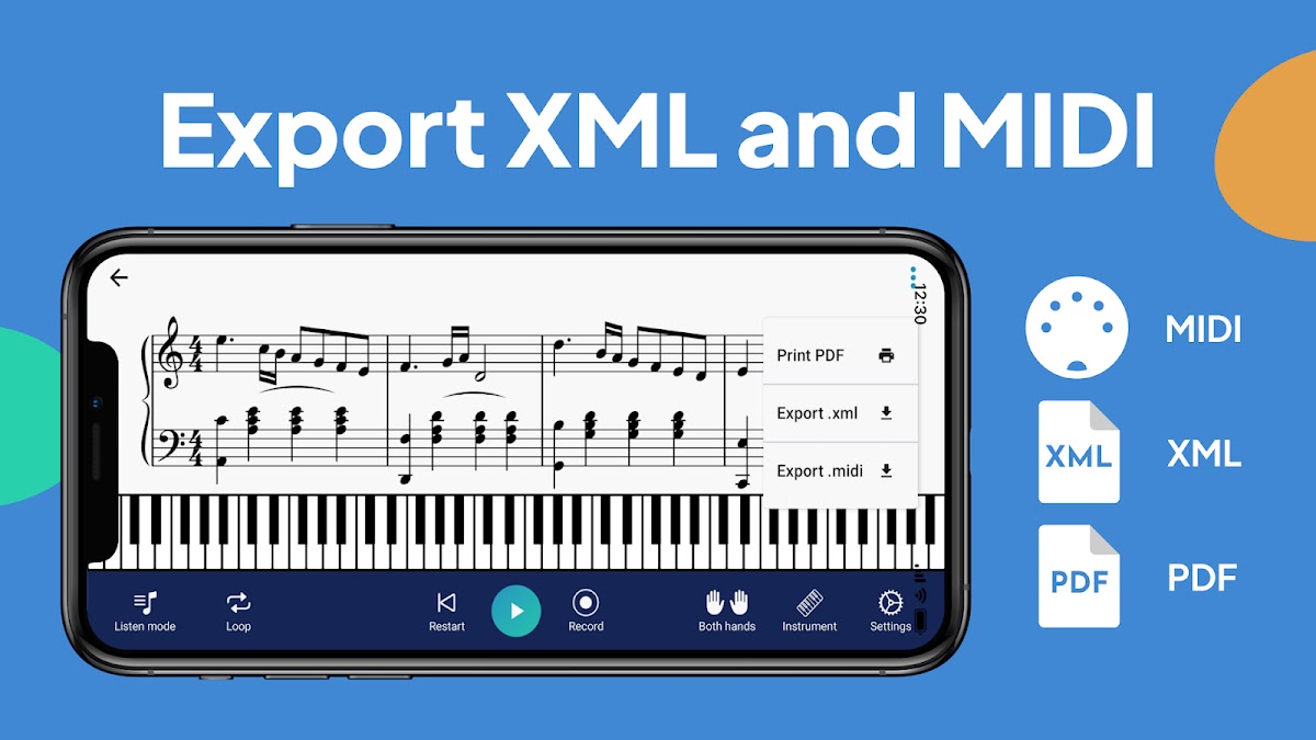 Получите доступ к сотням песен и сборникам песен с музыкальными произведениями для всех уровней, от новичка до продвинутого. Экспортируйте файлы в форматы MIDI и XML, распечатывайте ноты в формате PDF.