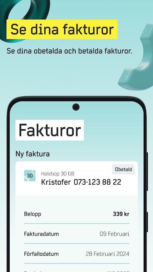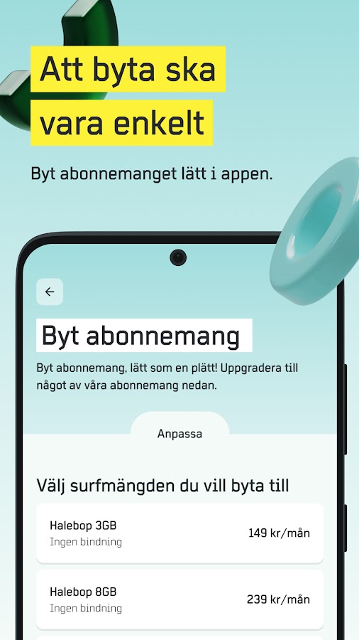 С нашим приложением у вас есть простой обзор ваших подписок и проверить, сколько серфинга у вас осталось. Вы можете купить дополнительный прибой, если он начинается, и иногда мы прячем пасхальные яйца. Конечно, вы получаете доступ к счетам, платежным реквизитам, PUK-кодам, поддержке и т. Д. Чтобы использовать приложение, вам проще всего войти в систему с мобильного BankID, в противном случае вы можете заказать персональный код через службу поддержки.