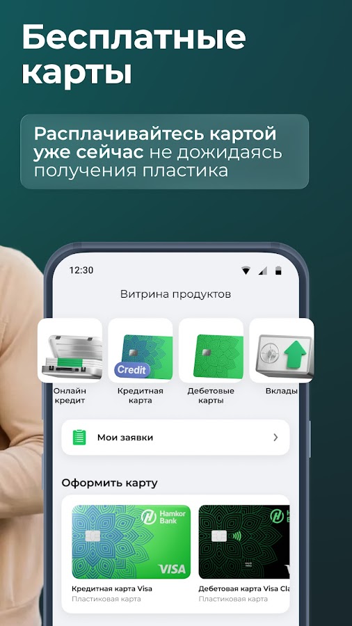 Оформляйте и управляйте своими картами, включая локальные и кредитные банковские карты Visa. Всё это доступно прямо в приложении, без необходимости посещать банк.