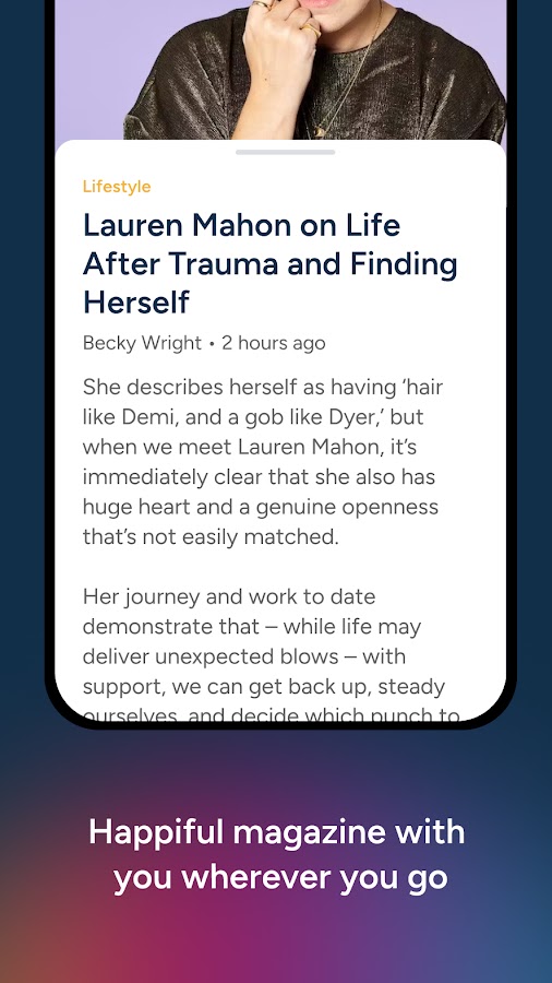 Откройте для себя приложение Happiful, где вы найдете все выпуски журнала Happiful Magazine в одном месте, готовые к прочтению в любое время и в любом месте. Наше приложение, созданное для того, чтобы предоставить вам удобство цифрового чтения, предоставляет контент, проверенный экспертами, и вдохновляющие истории, которые поднимают настроение и расширяют возможности.