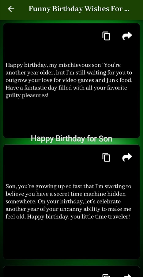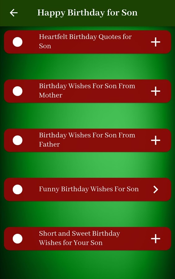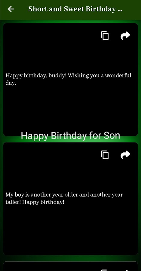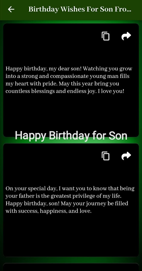 поздравления с днем рождения моему сыну Приложение обеспечивает удобный интерфейс, позволяющий легко просмотреть хорошо организованный список пожеланий и сообщений, подходящих для дня рождения вашего сына. Вы можете выбрать сообщение, которое лучше всего передает ваши чувства и соответствует личности вашего сына.