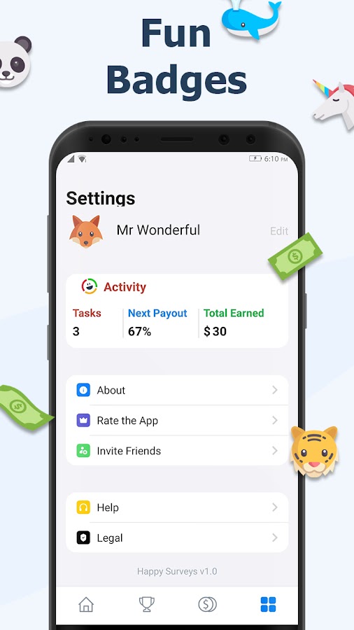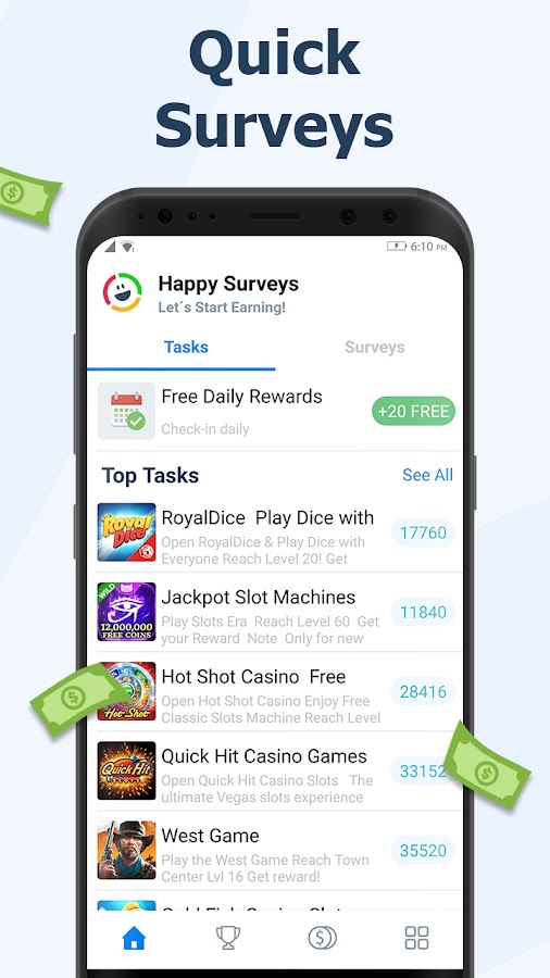 Ваша мобильная мини-работа не только проста, но и интересна, зарабатывайте на опросах прямо сейчас. Реальные деньги ждут вас! Будьте умнее и зарабатывайте на опросах! Happy Surveys лидирует среди приложений для проведения опросов, которые оплачиваются наличными.