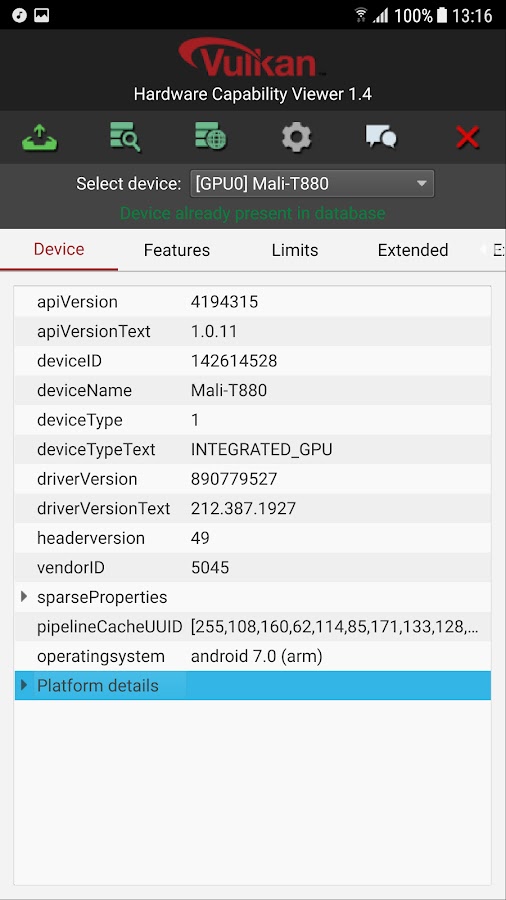 Отчеты, генерируемые этим инструментом может быть загружен в публичной базе данных (http://vulkan.gpuinfo.org/), где они могут быть по сравнению с другими устройствами на различных платформах.