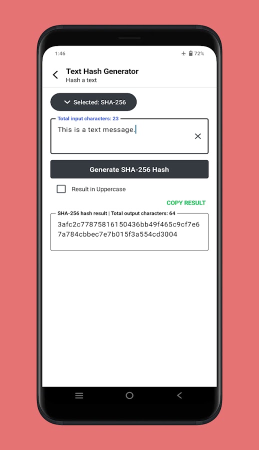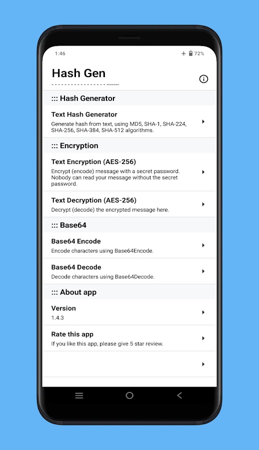 MD5 Hash Generator — бесплатное приложение для Android-генератора хешей. Он позволяет любому создавать криптографические хеш-значения из строки. Для генерации хэша из строки он использует различные алгоритмы хеширования, такие как md2, md4, md5, sha1, sha224, sha256, sha512, gost, gost-crypto, adler32, crc32, fnv1a64, joaat, haval и многие другие.