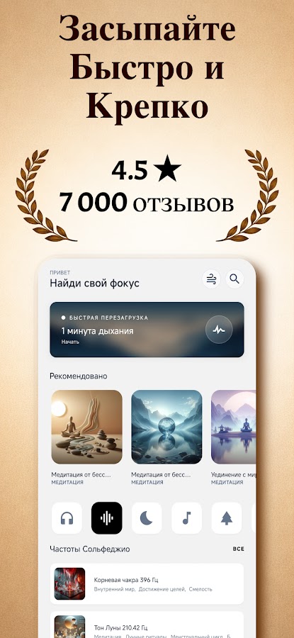 Исцелите свой разум и душу с помощью трансцендентных звуковых волн с целительной частотой. В нашем приложении Sound Therapy вы можете слушать Бинауральные ритмы (Ритмы головного мозга), Частоты сольфеджио, Звуки медитации и многое другое. Если вы никогда не слышали о лечебной звуковой терапии, это идеальное приложение, для того чтобы попробовать. У нас есть популярные расслабляющие звуки, такие как Звуки природы или музыка для Йоги. У нас также есть более специализированные ритмы и звуковые волны для терапии, такие как Частоты сольфеджио, Тибетские поющие чаши, мантра медитации Ом, Бинауральные ритмы и многое другое!