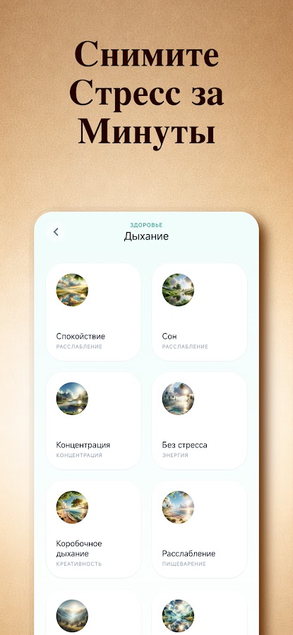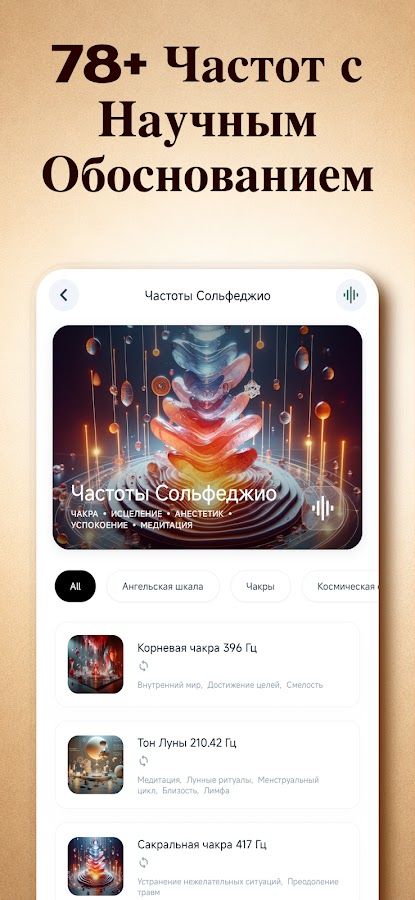 Каковы преимущества звуковой терапии? Помимо хорошо известных эффектов, таких как антистресс, успокаивающее действие, расслабление и снотворное, есть еще много преимуществ которые вы получите, медитируя и слушая определенные звуки, волны и частоты. Эти звуки помогут улучшить ваши когнитивные функции, такие как обучение, творческие способности и концентрация. Трансцендентные звуки, такие как мантра медитации Ом, Тибетское поющие чаши, музыка для йоги и частоты сольфеджио повысят вашу духовность, интуицию и мозговую активность. Слушая целительные звуки вы можете почувствовать прямое воздействие на свое тело, такое как увеличение энергии и более стойкий иммунитет. Просто откройте наше приложение и выберите эффект, который вам нужен, а наше приложение воспроизведет для вас исцеляющие звуковые волны.