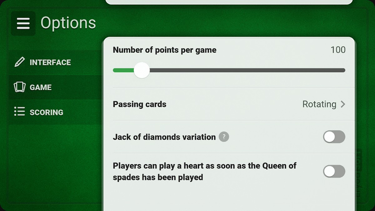 Play the famous game of Hearts against opponents simulated by advanced artificial intelligence.