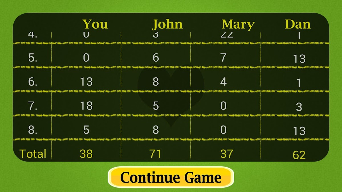 Играй в самую увлекательную игры Червы. Чтобы выиграть, необходимо избегать получение скоринговых карт. Ты также можешь Покрутить Динамо. Игра заканчивается, когда один из участников набирает по крайней мере 100 очков. Ты выигрываешь, если набираешь наименьшее число очков. Хотя многое зависит от удачи, ты можешь постараться и выиграть.