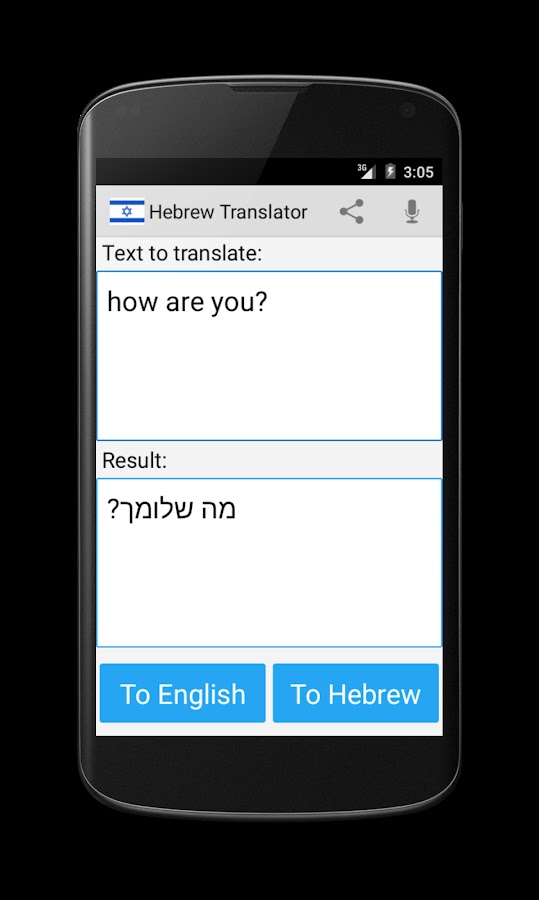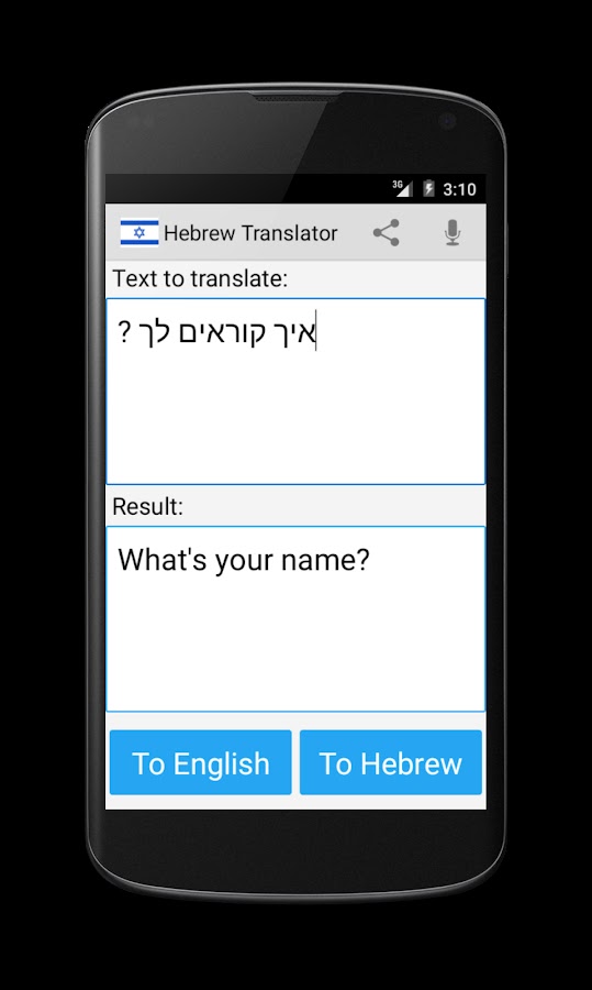 Это бесплатное приложение может переводить слова и тексты с английского (или русский) на иврит и с иврита на английский. Очень полезное приложение для легкого и быстрого перевода, который может быть использован как словарь.