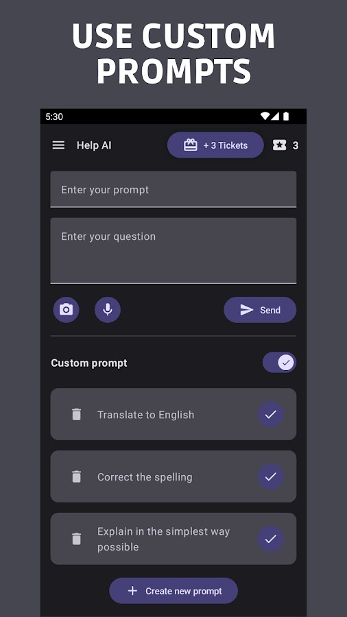 • Пользовательские подсказки: вы можете создавать и сохранять персонализированные инструкции, чтобы помочь в ваших запросах. Это полезно для часто используемых инструкций. Приложение поставляется с некоторыми предустановленными подсказками, но вы также можете создать свои собственные!