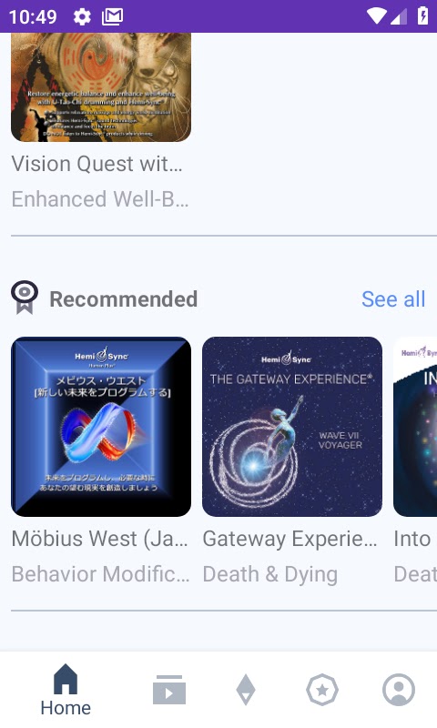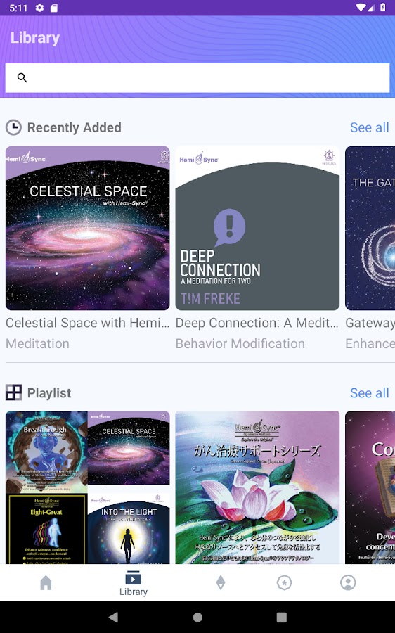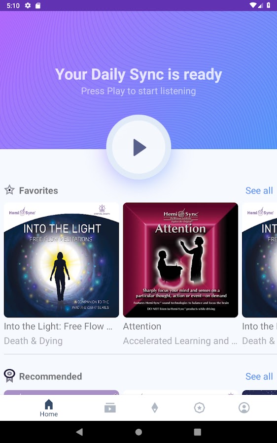 Hemi-Sync® Flow предлагает тщательно подобранный выбор из нашей обширной библиотеки, что делает его идеальной отправной точкой для тех, кто плохо знаком с исследованием сознания или ищет целенаправленный опыт. Получите доступ к более чем 300 наименованиям из библиотеки Hemi-Sync®, включая шесть известных упражнений Gateway Experience®, со своего мобильного устройства по низкой ежемесячной подписке. Создавайте собственные треки Hemi-Sync®, используя функцию микшера, и наслаждайтесь нашей бесплатной функцией DailySync, которая воспроизводит один трек в день.