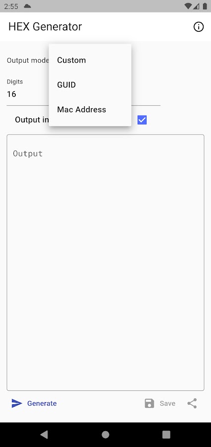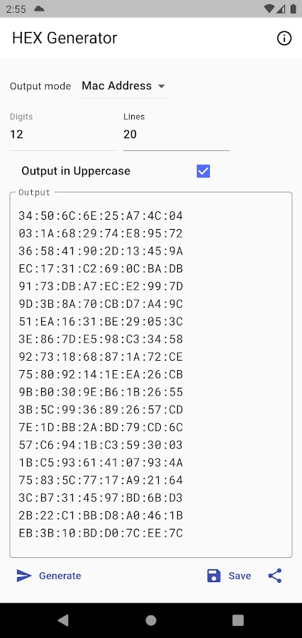 Простой генератор шестнадцатеричных строк с возможностью генерировать 3 различных типа, включая MAC-адрес и GUID. Вывод может быть сгенерирован в нижнем и верхнем регистре