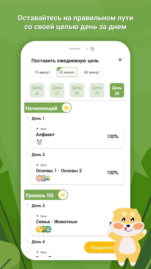 7. Персонализированный план обучения: Приложение создаёт индивидуальный учебный план, соответствующий вашим целям. Выберите, сколько времени вы готовы уделять изучению языка каждый день — 15, 30 или 45 минут — и приложение подберёт для вас подходящие уроки и навыки. Это как иметь собственного преподавателя в вашем кармане!
