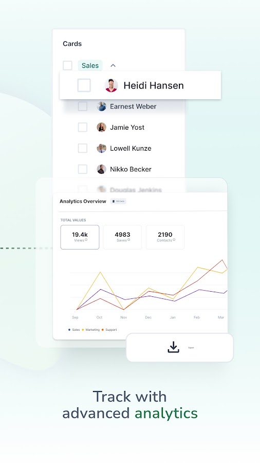 — Получите ценные сведения об использовании визиток, вовлеченности и генерации лидов с помощью аналитики в приложении и интеграции данных.