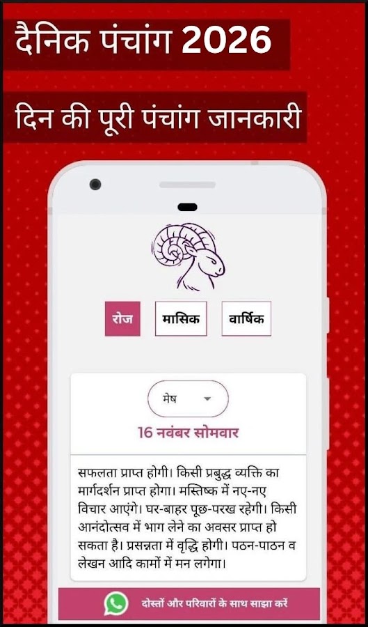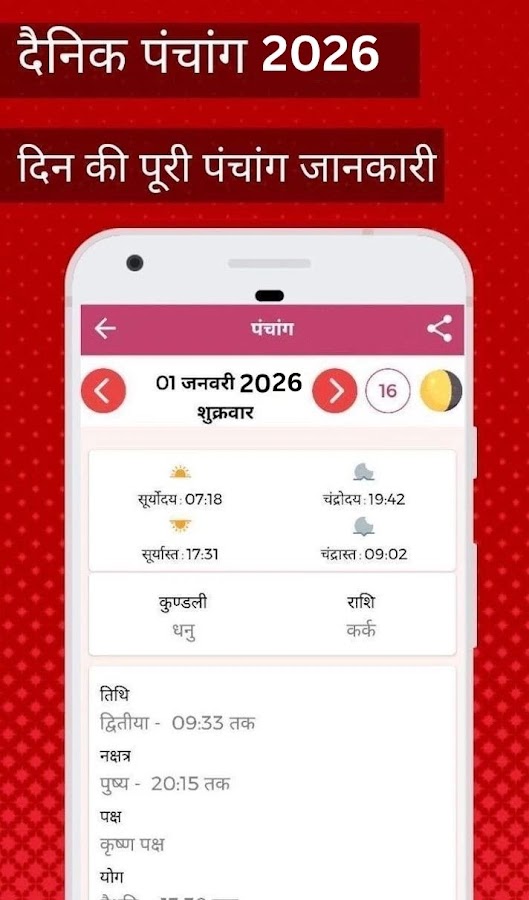 Индуистский календарь Панчангам на 2026 год (हिंदी पंचांग): хинди Панчангам на 2026 год содержит все подробности астрологии и гороскопа. Приложение также включает ежедневный Панчанг (पंचांग), включая гороскоп на сегодня (राशिफल) титхи. Это индуистский календарь на 2026 год с офлайн-календарем, который показывает сегодняшний Панчанг на хинди.