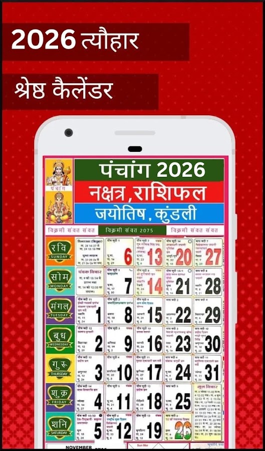 2026 हिंदी कैलेंडर — Hindi Calendar 2026 — это офлайн-календарь и бесплатное приложение-календарь для всех говорящих на хинди в Индии. Приложение «Индийский календарь» очень полезно для информации о праздниках, фестивалях, Шуб Мухурат и индийском панчанге 2026 , а также о календаре на 2026 год.