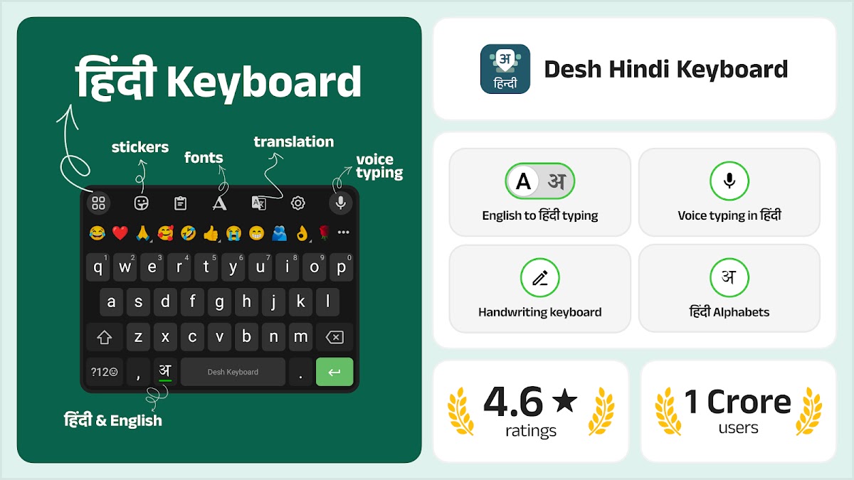 Desh Hindi Keyboard — это приложение для клавиатуры с английского на хинди, которое позволяет печатать на хинди быстрее, чем когда-либо прежде.