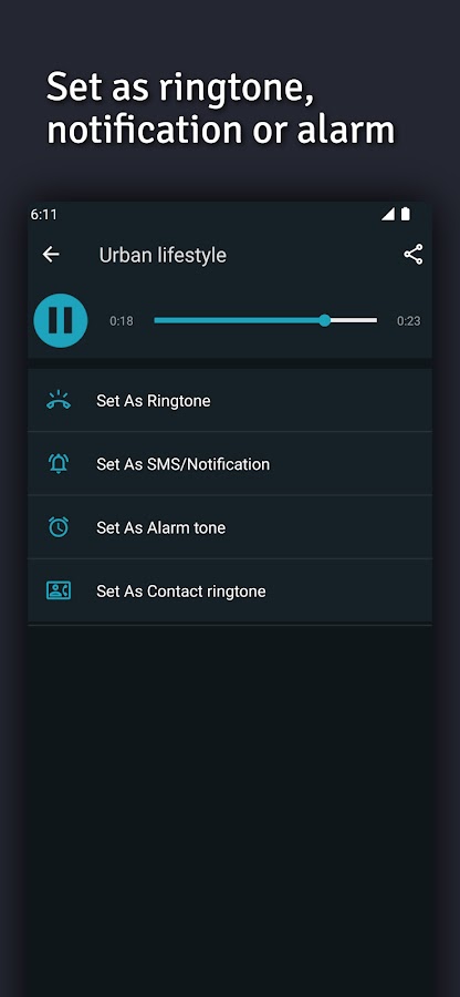 -Установка в качестве рингтона по умолчанию, рингтона контакта, SMS-уведомления и будильника.