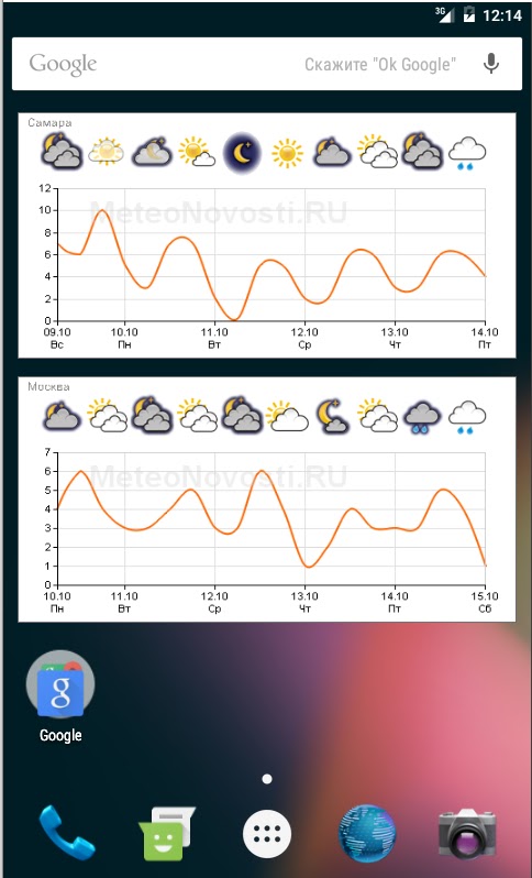 Виджет отображает прогноз погоды на 5 и 14 дней в виде графиков.