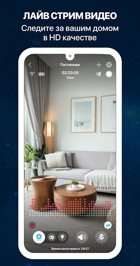 Оцените возможности ночного видения (с зеленым фильтром), чтобы следить за своим домом, как бы темно ни было! А когда вам понадобится дополнительная яркость, просто включите функцию фонарика на своем мобильном телефоне, чтобы получить кристально чистый вид на каждый уголок.