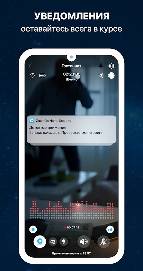 Вы нервничаете и чувствуете себя некомфортно, оставляя свой дом без охраны? Home Security Camera ZoomOn пригодится вам, когда вы покидаете дом на работу, в отпуск или по делам. Поэтому смахните пыль с неиспользуемого телефона и дайте ему новое предназначение — превратите его в камеру безопасности!