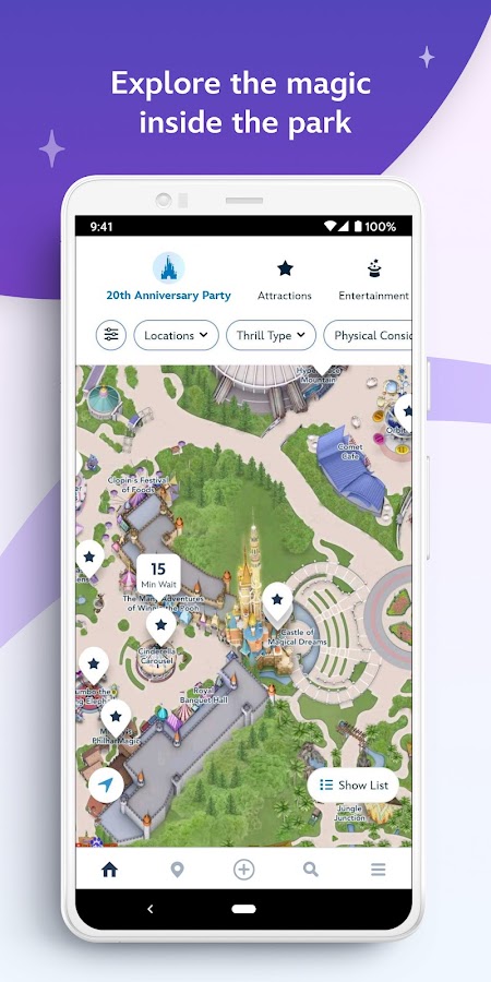 Сделайте свой следующий визит очаровательным с помощью мобильных устройств. Посмотрите приблизительное время ожидания аттракционов, просматривайте карту парка, смотрите расписание и многое другое!
