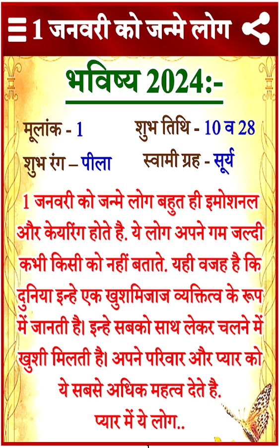 В этом приложении мы расскажем вам о вашем гороскопе на 2024 год на хинди по датам и о том, каким будет для вас 2024 год согласно нумерологии. Здесь вы можете узнать о своем счастливом числе, цвете благоприятных дат, а также узнать свою природу. С помощью этого приложения вы получите полный годовой гороскоп Джанама Тариха Се Джейн Апны Бхавишая на 2024 год. Вы можете использовать это приложение как онлайн, так и офлайн.