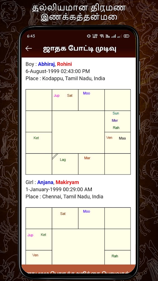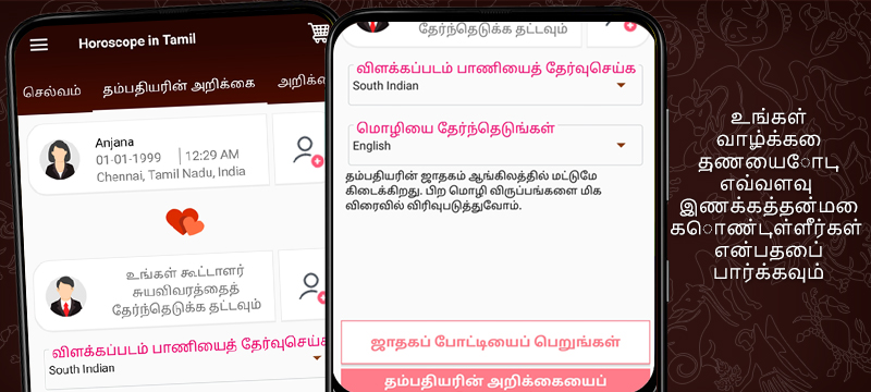 Thirumana porutham на основе ведической астрологии в тамильском еще одна красивая функция, включенная в это приложение Тамил Jothidam. Поиск подходящего партнера играет важнейшую роль в развитии жизни и правильный выбор партнера из предложений брака немного сбивает с толку. Thirumana porutham или гороскоп соответствие помогает нам знать о совместимости брака между женихом и невестой с легкостью. Jathaga porutham на основе Южной Индии и Северной Индии, Восточной Индии, методы, соответствующие Кералы доступны в этой ведической астрологии приложения.