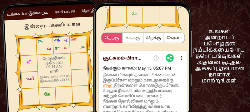 Гороскоп на тамильском языке действительно есть возможность обеспечить расчеты & предсказание, основанные на любом географическом положении и он может генерировать jathagam на основе тамильского, Керала, на севере Индии и Востока индийских стилей астрологии диаграммы.