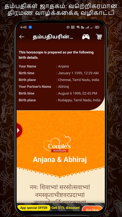Этот гороскоп приложение основано на ведической астрологии в тамильском дают точные расчеты и прогнозы, наряду с важными астрологическими картами. Гороскоп на тамильском позволяет создавать неограниченное количество Тамил Jathagam для вашей семьи, друзей и родственников. Идите вперед, Просмотр и анализ персонализированных Тамил jathagam, введя подробности о рождении ваших близких. Прелесть этой функции заключается в том, что он работает в автономном режиме!