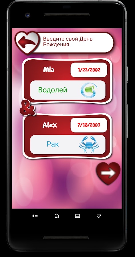 После того, как все детали введены, и отображается ваш знак зодиака, приложение отсканирует имена и знаки зодиака, а индикатор теста на любовь покажет процент совпадений с любовью. Это действительно не может быть проще!