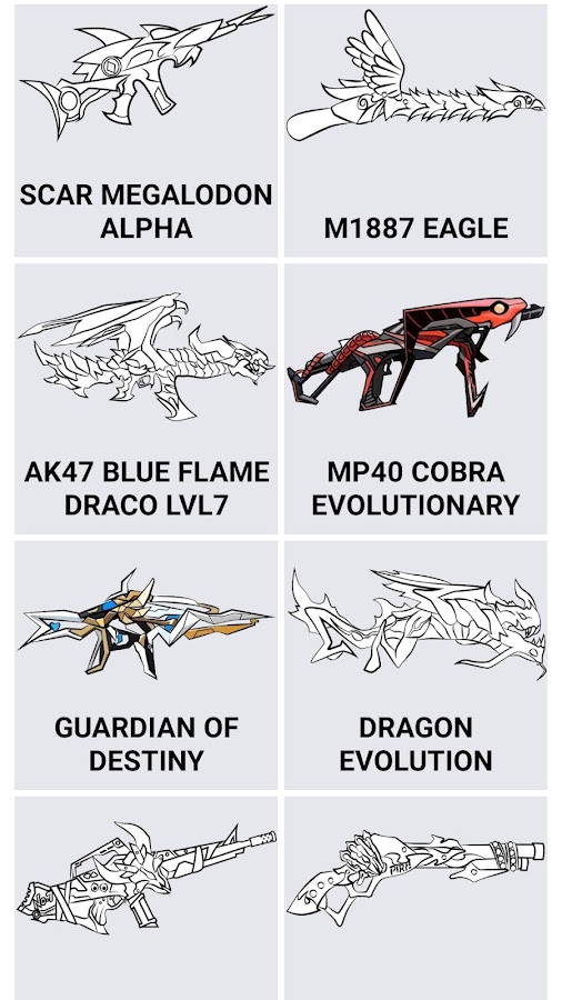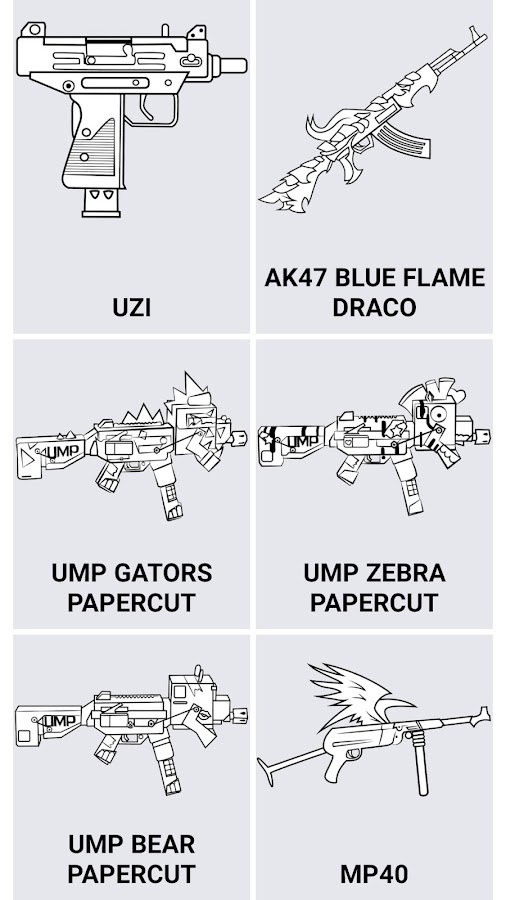 Приложение Как рисовать Фри Фаер поэтапно это уникальное приложение, которое научит вас рисовать героев игры Free Fire на листке бумаги. Для удобства мы реализовали уроки на листке в клетку, чтобы вы смогли нарисовать героев игры комфортно. Ведь у нас есть, что порисовать! 20 уроков как нарисовать оружие из игры Фри Фаер. Так чего же вы ждете? Скорее устанавливайте и у вас не возникнет вопросов, как рисовать оружие из игры.