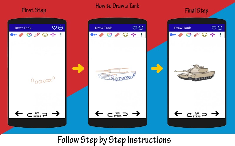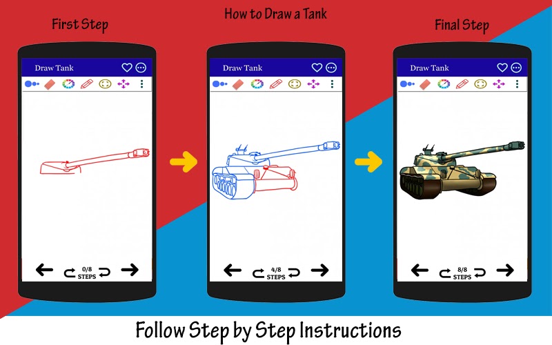 Так чего же ты ждешь? Загрузите и установите наши учебники по рисованию танков для взрослых и детей прямо сейчас! Наш легкий рисунок для начинающих поможет вам научиться рисовать танк легко прямо на вашем смартфоне бесплатно. Приготовьте бумагу и карандаши и начните учиться рисовать военную машину шаг за шагом и станьте профессионалом в навыках рисования татуировок.