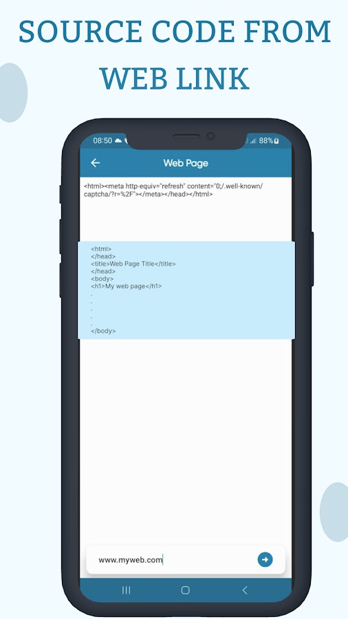 Нажмите кнопку веб-страницы, чтобы перейти к экрану, где вам нужно ввести URL-адрес любой веб-страницы, чтобы просмотреть ее исходный код.