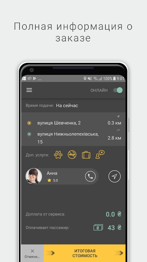 • Полная информация о заказе: откуда, куда, расстояние до клиента и по маршруту, способ оплаты, стоимость;