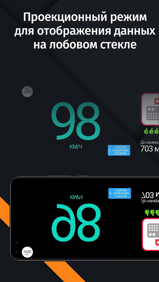 HeadUp Display (HUD) – это возможность использовать ваш телефон или планшет как проекционный дисплей. Просто положите устройство под лобовое стекло и вы увидите проекцию скорости и предупреждений о камерах прямо на стекле. Не нужно отвлекаться от дороги — все непосредственно перед вашими глазами!