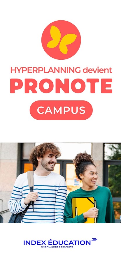 PRONOTE Campus (ранее HYPERPLANNING) — это официальное приложение, опубликованное Index Éducation. Студенты и преподаватели получают доступ к информации и функциям интерфейса в соответствии со своим профилем и правами доступа, предоставленными им учебным заведением. Каждый пользователь получает доступ к своим данным, используя имя пользователя и пароль, предоставленные учебным заведением.