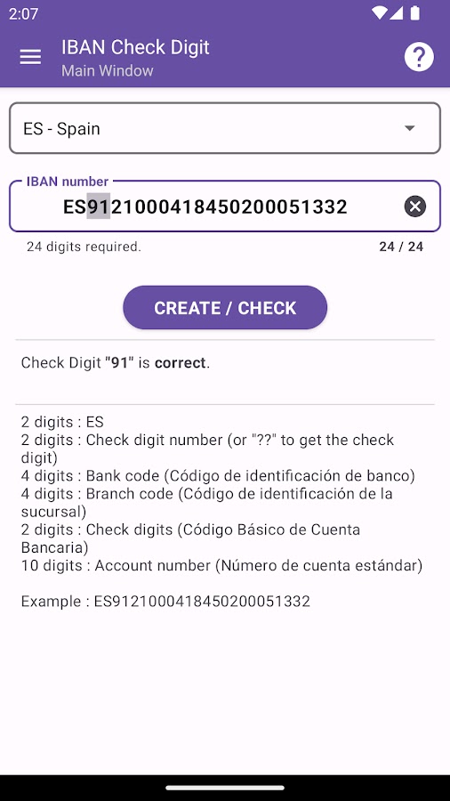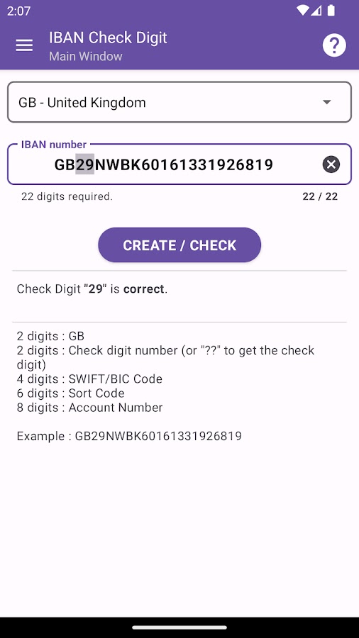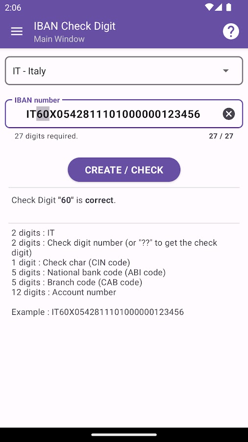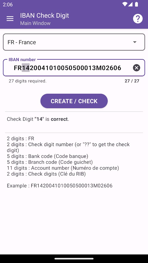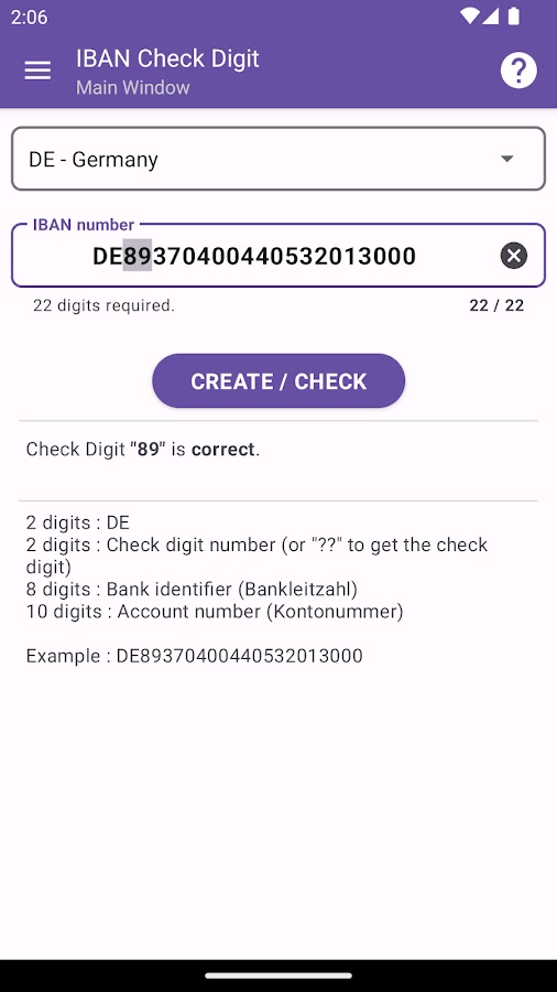 Это приложение может создавать или проверять номер IBAN (Международный номер банковского счета) в соответствии со стандартом ISO 13616.