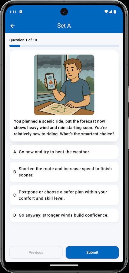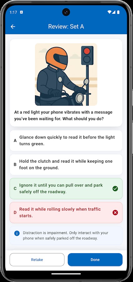 🏍️ Обширная база вопросов: Получите доступ к обширной базе актуальных вопросов, максимально приближенных к официальному экзамену ICBC на знание правил дорожного движения для мотоциклистов.