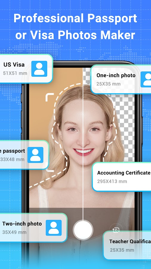 Легко выбирайте фотографии из альбома или делайте их на свой мобильный телефон, мы автоматически сделаем все за вас. Всего за несколько секунд вы сможете получить то, что вам нужно. ID Photo & Passport Photo Maker, Visa Photo Maker стремится предоставить вам возможность редактирования фотографий на документы высочайшего качества. Сделайте ваши фотографии на документы более профессиональными и совместимыми и сэкономьте свои деньги.💯