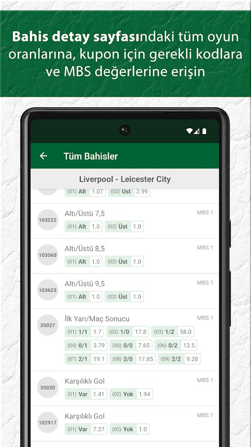 Получите мгновенный доступ к последним шансам на все матчи с текущей программой İddaa ™.
