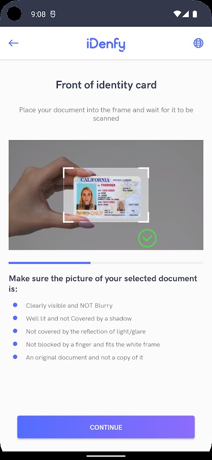 Цель IDenfy — превратить смартфон вашего клиента (iOS и Android) или компьютер в терминал сканирования ID, который позволяет быстро и легко захватывать и проверять их идентификатор и другие учетные данные для соответствия требованиям KYC. Сканирование и проверка подлинности в режиме реального времени применяется на веб-сайтах и мобильных приложениях, что помогает снизить риск и свести к минимуму мошенничество для онлайн-транзакций.